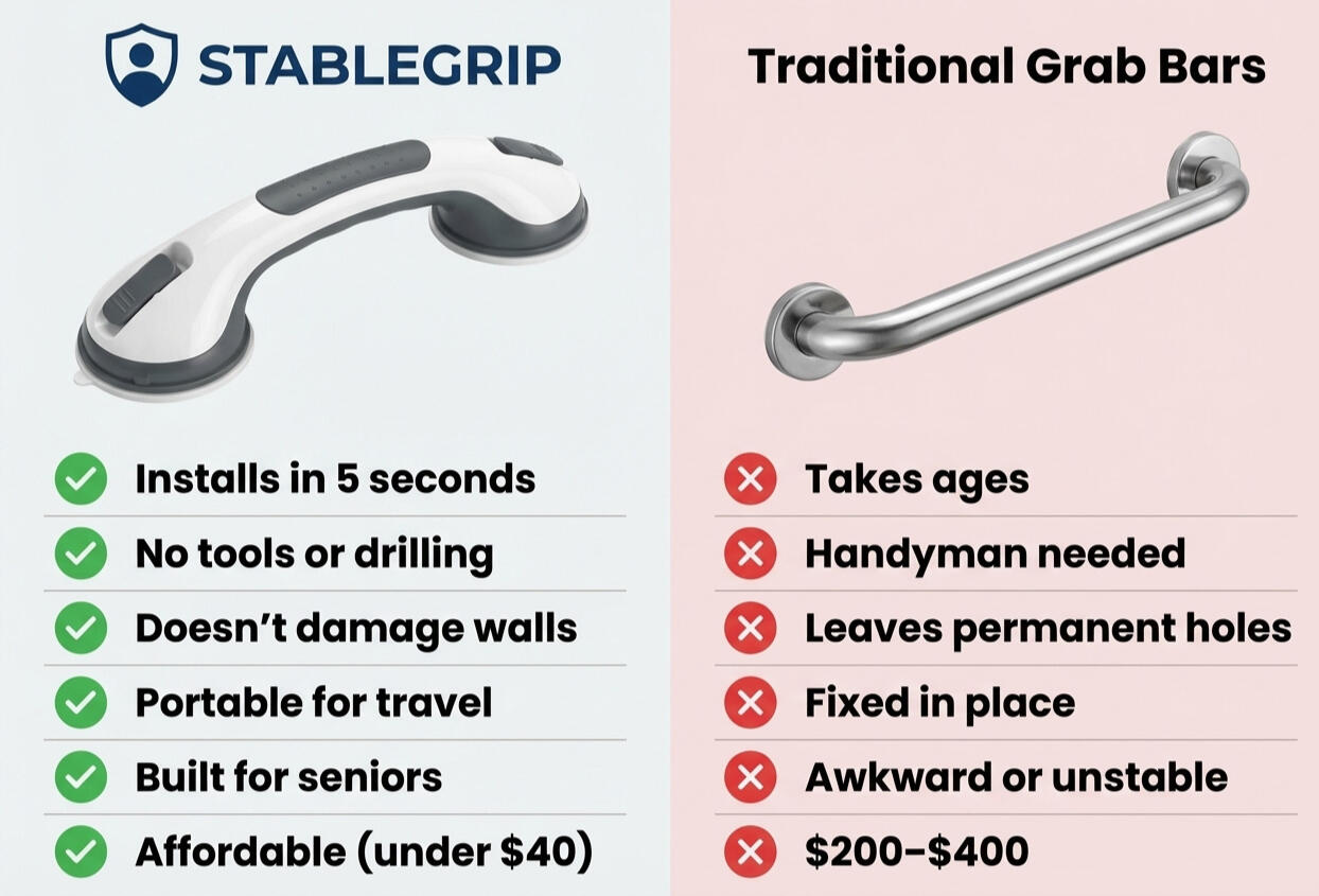 It's a portable safety handle with industrial-strength suction cups and lock-down latches that grips any smooth surface — tile, glass, marble, fiberglass — and holds up to 240 pounds.No drills. No tools. No contractor. No wall damage. No permission from your landlord.What makes StableGrip different:❌ Permanent grab bars: $300-500 installed, requires drilling, damages walls, needs a contractor, 2-week wait❌ Shower chairs: Bulky, embarrassing, doesn't help getting IN and OUT❌ Bath mats: Only helps footing — nothing to grab when you lose balance❌ Towel bars: Decorative — will rip out of drywall under body weight✅ StableGrip: Installs in 5 seconds, holds 240 lbs, portable, removes cleanly, looks modern — not medical